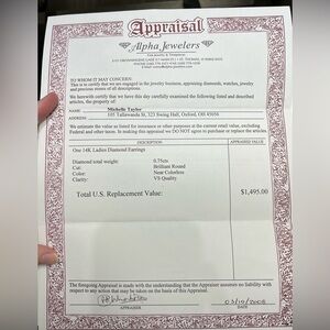 My pricing is based on conversations I had today. Re: my appraisal document: please note this is my original appraisal from March 2008. For insurance purposes now, I would insure at $2250, not at $1500 due to inflation and differences in gold prices. Replacement value *could* be as high as $2500, but I am shooting a bit lower.