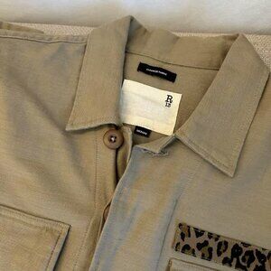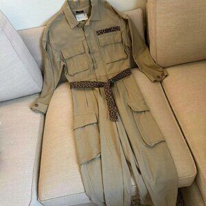 Spread collar. Concealed button closure at front. Flap pockets and embroidered logo in black at chest. Integrated adjustable cinch belt featuring leopard print in black and beige at waist. Adjustable buttoned tab at cuffs. Tapered leg. Two-pocket styling. Pleats at front. Flap pocket at outseams. Antiqued gunmetal-tone hardware Worn 1x, in excellent used condition No Trade, No Lowball