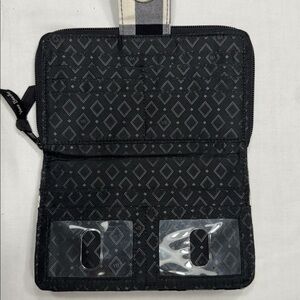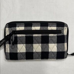 This is a RFID Vera Bradley Pearl Buffalo Check wallet with turn lock & zipper closures. This wallet features RFID protection for credit & debit cards. It has 12 card slips, 3 bill slips & 2 ID windows. Exterior is a quilted cotton. It measures 7.5” W X 4.75” H & .75” D.