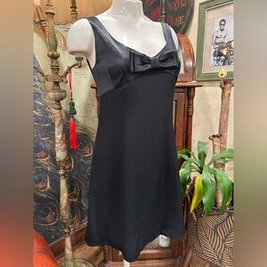 Indulge in the luxurious feel of this black chemise mini dress designed with delicate front bow and wide spaghetti straps for a perfect fit. The soft fabric bottom skirt ensures a comfortable and elegant experience, making it an ideal choice for any event. Perfect cocktails dress. Top part is satin finish. Cute back pillow buttons.