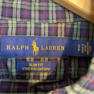 Upgrade your wardrobe with this classic Ralph Lauren Slim Fit Oxford Shirt, featuring a timeless green and navy plaid pattern with subtle red accents. Designed in a stretch cotton blend for comfort and style, this long sleeve button-down shirt is perfect for both casual and semi-formal wear.