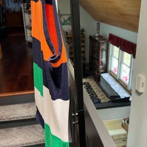 Elevate your wardrobe with the Women's Multicolor Striped Top. Featuring bold stripes in blue, orange, green, and white, this top adds a vibrant touch to any outfit. Perfect for casual outings or a day at the office. length 25”, -it to,pit 19”. From a smoke free 🏡