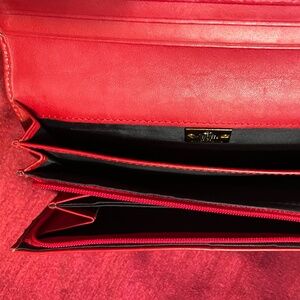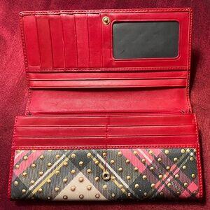 This Vivienne Westwood coated-leather long wallet has a beautiful multicolor plaid tartan exterior dotted with rounded gold colored studs, fold-over style with snap closure topped by its gold orb emblem. The interior has leather with several gusseted interior compartments, one with a zip closure. The snap side flips open and hold many cards, one with a clear cover. There is gold tone hardware. Made in Italy. Measures: .~7"x4"x1" EUC noting minor scuffs, creases. #petfree #smokefree