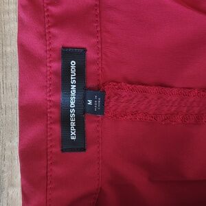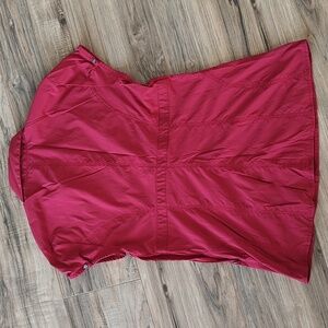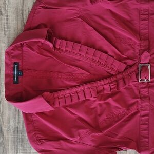 Excellent condition, no rips, stains, or holes. Red v-neck blouse with ruffles around the neckline. Has a decorative silver buckle around the middle. The blouse has a side zipper closure and capped sleeves. Smoke free home.