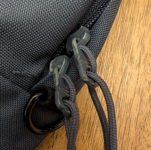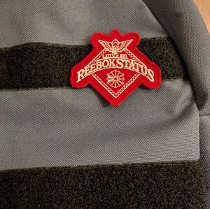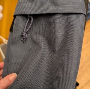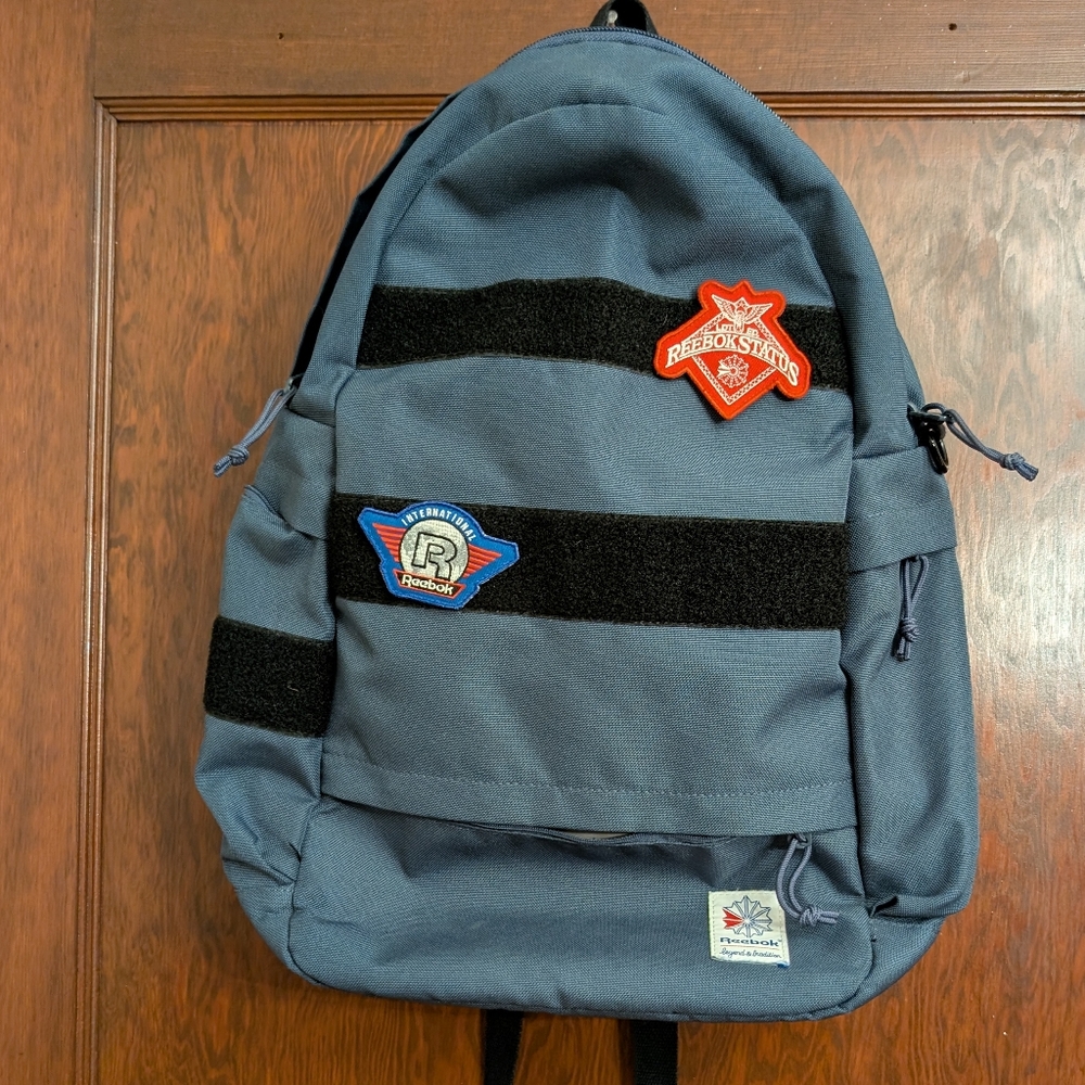 Two Velcro patches on front in a retro look. Blue body with multiple pockets, including a laptop sleeve inside. Clean, like new inside. Paint on zippers is slightly chipped, but otherwise this backpack is like new!