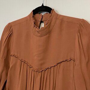 Reformation Jourdan dress featuring a mockneck with ruffle trim, ruched ruffle cuffs, ruffle detail on the yoke and gathering through the body, back button and loop closure, a fully-lined interior, and a 100% viscose fabrication in a crepe texture. Neutral orangey cognac brown shade