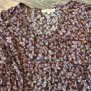 This is lovely 90's looking burgundy dress with purple butterflies throughout. It has pockets and buttons down the front. It could be vintage, I'm not certain.