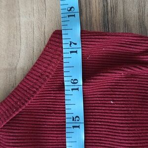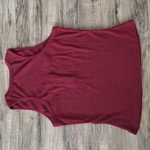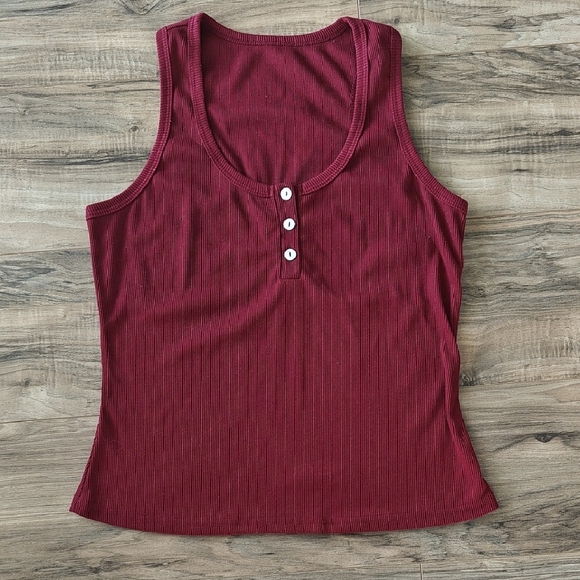 Excellent condition, no rips, stains, or holes. Maroon ribbed racerback tank top with 3 henley style button details on the front. No brand, tag says size large, but fits smaller in my opinion.