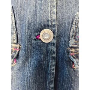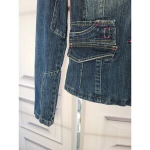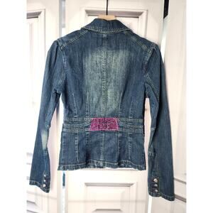 Lower front flap pockets with small slit pockets above. Stitch details throughout. 2 button up closure with silver buttons. Small slit pocket on top left with pink sequins. Collar. Tailored fit. Pink sequins on mid backside. Slight flair shape on backside. 3 silver button cuff closure. Factory distress on end of hem. Factory fading on back of elbows. 99% Cotton / 1% Spandex. Excellent condition.