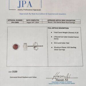 Beautiful 0.10 carat round cut color-treated red garnet stones and rhodium plated .925 sterling silver earrings.