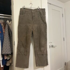 EUC Rudy jude moss corduroy utility pants size 5. 100% organic wide wale cotton. I love these but they are too big on me and I would be too afraid to dry them to try to shrink. Have been washed on gentle cycle with gentle detergent. Never dried. They don’t have an discoloration issues that some RJ items can have. Measurements taken flat waist 18, hips 20, front rise 13, inseam 26, leg opening at bottom 9