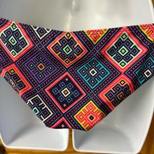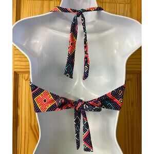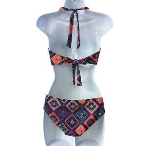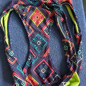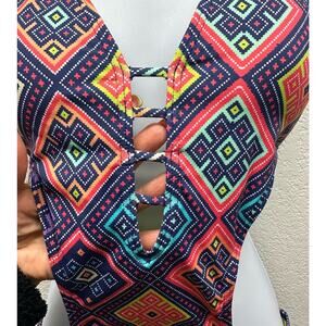 Details: Really SEXY! Colors compliment each other. Peek A Boo front and hip line. Ties at neck and mid back. Removable pads. Mannequin is a size small-medium.