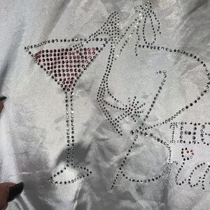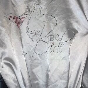 SUPER CUTE WHITE SATIN ROBE FOR THE BRIDE TO BE. HAS A MARTINI GLASS WITH RED RHINESTONES WITH A HIGH HEEL SHOE HANGING FRON THE SIDE.