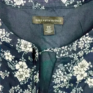 EUC Saks Fifth Avenue maxi dress. Peasant style maxi dress. Size medium. Floral print. Navy blue with white flowers. V-neck with tie closure, buttons from V to bottom ruffle. Elastic waist with drawstring. Lined. Mint condition.