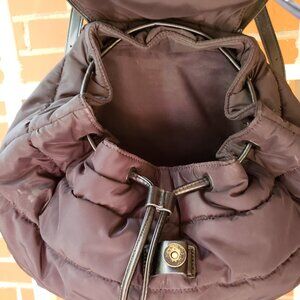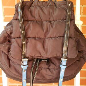 Single top handle, Dual adjustable shoulder straps, Foldover flap with magnetic closure and drawstring top closure, Exterior features puffer quilted construction, studded flap trim with buckle strap detail, Interior features 8 card slots, 2 slip pockets.