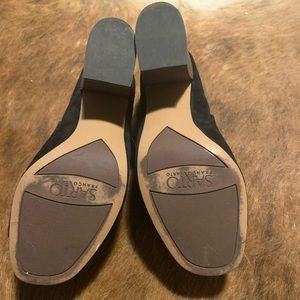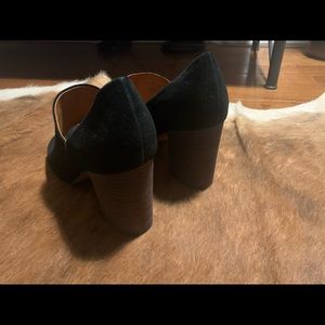 Black suede featuring a wood look block heel and peeptoe! Very cute and good for many outfits.