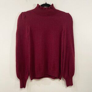 Sézane Brianna pullover sweater featuring a mock neck with ruffle trim, puff sleeves with fitted cuffs, and a medium weight 95% cashmere yarn in a beautiful shade of wine red--more on the pink side than typical. Like a raspberry pink