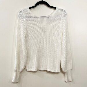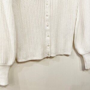 Sézane Marietta cardigan sweater featuring a square neck, puff sleeves, mother-of-pearl style buttons, and a 100% cotton fabrication in a classic off-white shade.