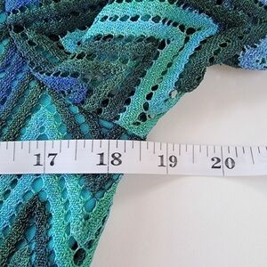 Sharagano sheath dress. 100% crochet textured polyester; chevron blue green turquoise pattern. Lined bodice, sheer sleeves. Measures flat 18.5 underarm seam to seam. 19" bell sleeves. Length is 34" from shoulder to hem. Size 4 EUC