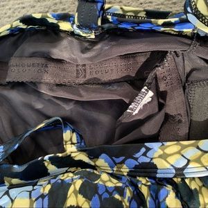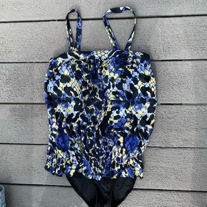 Excellent condition and no flaws. Floral Silhouette Solutions 1 piece swimsuit with blouson top piece. Swimsuit is all one piece but is 2 layers. See pics. Adjustable straps and non removable bra pads, not thick. Measurements are of the under part of the swimsuit. Labels have been removed