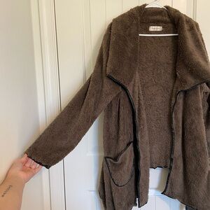 Women’s Simply Couture cardigan jacket. Jacket is made of brown fuzzy/furry material with an outline of faux leather. Size large, fits oversized. Smoke free home!