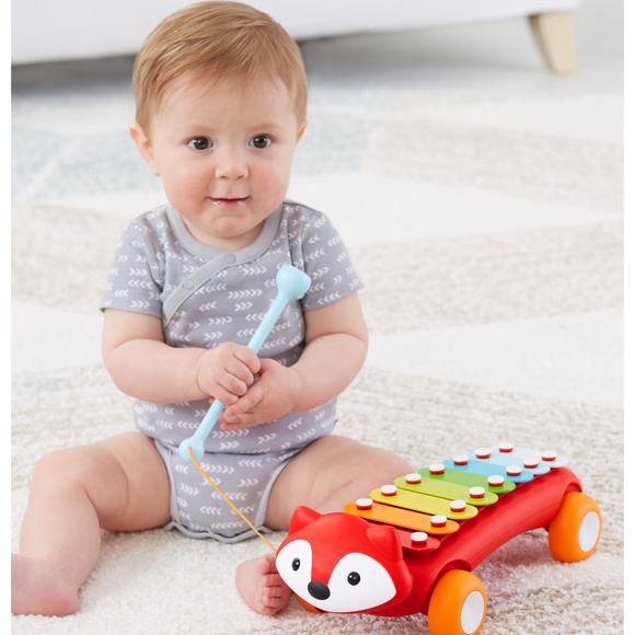 Excellent, like-new condition Fox Xylophone toy by Skip Hop. 🦊 This adorable fox inspires early musical creativity with eight colorful keys, providing a full scale of musical notes. The mallet is attached so they can take their tunes wherever they go—and it won’t get lost! It snaps into the bottom of the xylophone for easy storage. Also serves as a fun pull toy for early walkers to take their pet Fox on adventures. The fox’s head bobs up and down as it’s pulled around.
