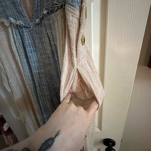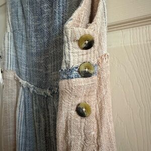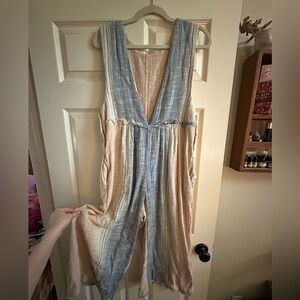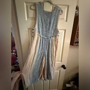 Stylish, reversible sleeveless jumpsuit. Features a blue and cream striped pattern. Deep V-back design. Perfect for casual outings. Pet free, smoke free, fragrance free home.