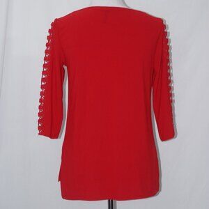 Love Scarlett Womens Small Red Top Peekaboo Sleeves / Chest Polyester-Spandex Christmas Holiday Party EUC This women's shirt is in excellent condition; no signs of wear. The sleeves have peekaboo openings from shoulder to bottom and they are ¾ sleeves. The chest has a peekaboo too. The back is slightly longer than the front by a few inches. The approximate measurements for this women's shirt are: 25” shoulder to front bottom and 18.5” pit to pit.