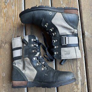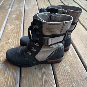 EUC Sorel Major Carly Black Leather Side Zip Military Combat Boots in Size 7.5