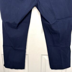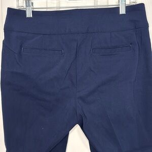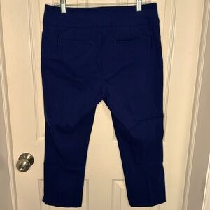 EUC St John’s Bay Pull On Capris, size 10. Color is navy blue. Small slit on the bottom side of each leg. Non-functional pockets front and back. Pants have a lot of stretch. Fabric is 80% rayon, 17% nylon and 3% spandex.