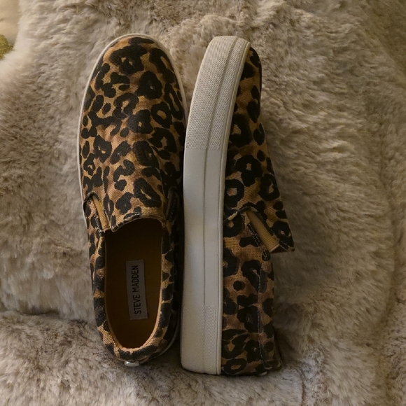 EUC chic animal print slip-ons by Steve Madden. Features a striking pattern with a sleek white sole. Size 10.