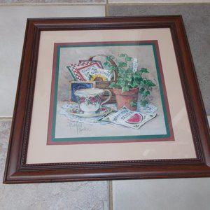 Euc, still life print by Barbara Mack professionally matted and framed. Print is 8"x8", wood frame 14"x14. Very Nice!