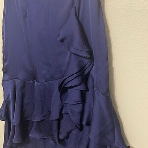 Excellent condition, navy blue ruffle midi skirt. Tonal dot pattern. Zip back, hook and eye closure. Lined. 100% Polyester.