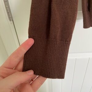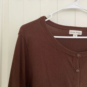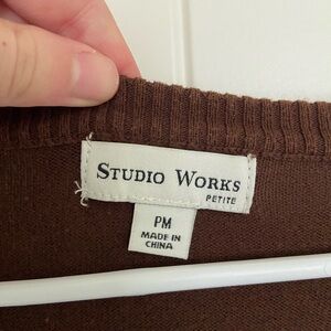 Women’s Studio Works cardigan sweater. Cardigan is made of brown lightweight material with full front button up style. Size petite medium. Smoke free home!