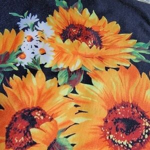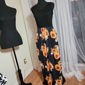 Maxi dress. 41" from elastic waist to hem. Black tank top with sunflower skirt. Measures 16.5 underarm seam to seam. 12" unstretched elastic waist. Stretchy poly/rayon. Size Small. EUC