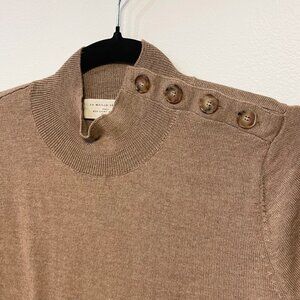 Sézane Jacob Jumper featuring a mock-neck, functional horn buttons at the shoulders, and a 100% merino wool fabrication in a biscuity camel shade. Light to medium weight. I personally love merino wool because it's not itchy!