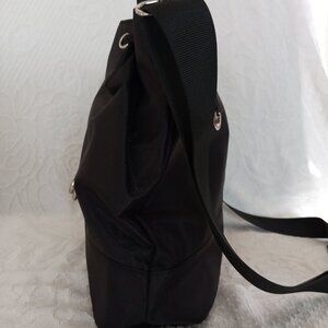 This is a large Travelon Anti-Theft RFID Bucket Bag in black with silvertone hardware. It is in excellent used condition -- clean with no rips, tears or stains. All zippers work perfectly.