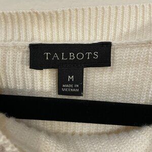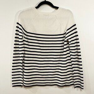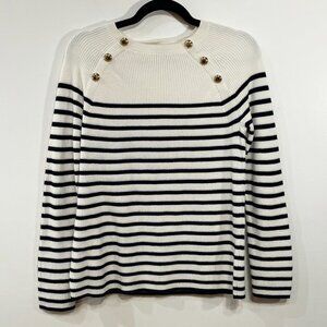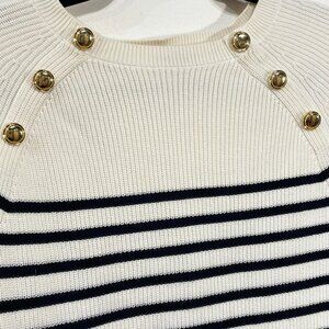 EUC Talbots 100% Pima Cotton Stripe Mariner Gold Button Sweater Cream Navy M