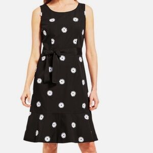 EUC Talbots 12P Petite 🌼 Black & White Daisy-Dot Dress — Tie-Waist, Flounce Hem