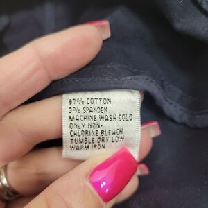 pre-loved, gently worn, like new condition, Cotton/spandex blend, button closure, pockets, fold up sleeve cuff.