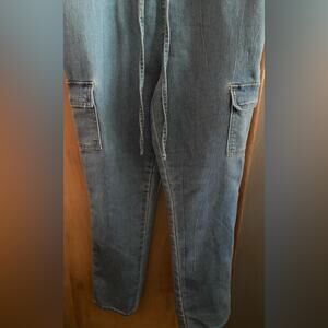 Tinsel Town Denim Adj Strap Cargo pockets Overalls Tie Front. Straps Adjustable buttons front toe back zipper light wash chest 34” waist 30” Strap to bottom 54” Inseam 26” 12” rise Size Small