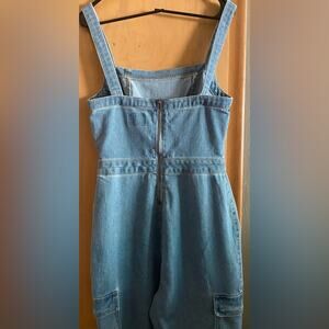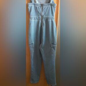 EUC Tinsel Town Sz Sm Light Wash zipper back btn strap Denim Cargo Overalls