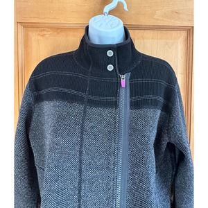 Details: A lot of texture, 2 front zip pockets, full zip is intentional off center, 2 snaps at collar, fully lined (even sleeves) with a soft microfiber fleece feel. Shoulders, Sleeve Cuffs & Pockets have tight knit sweater effect over tweed fabric.