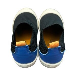 Comfortable black knit slip-on shoes with vibrant blue and orange accents. Perfect for everyday wear. Good used condition, kept at daycare as extra set of shoes.