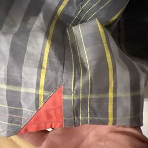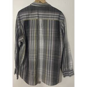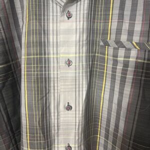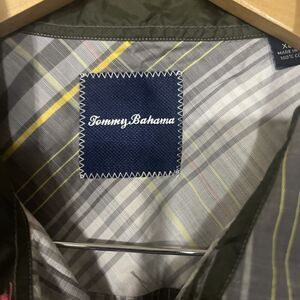 This stylish Tommy Bahama button-up shirt is a must-have for any fashion-conscious man. The gray and white check pattern adds a touch of classic sophistication to any outfit, while the long sleeves and collared neckline make it suitable for all seasons. The shirt is made of breathable cotton fabric and features a woven texture, making it comfortable and durable. It also has a button-down collar style and accents, as well as pockets, adding to its functionality and style. This shirt is perfect for a casual day out or a night on the town, and it comes in XL size, making it a great fit for most men.
