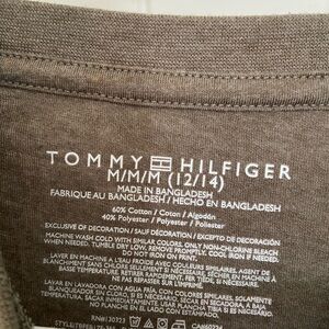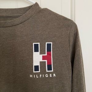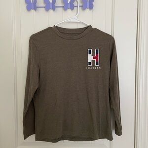 Boy’s Tommy Hilfiger shirt. Shirt is green colored material with a Tommy logo decal on the chest. Has a crew cut neck with long sleeves. Size medium. Smoke free home!