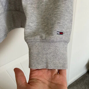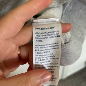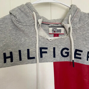 Women’s Tommy Hilfiger hoodie. Hoodie is gray with large logo on front & ripped design at neck (honestly can’t tell if someone did this or if it was made like this—but it looks cool & definitely serves a unique look!). Has pockets & drawstring. Size medium. Smoke free home!