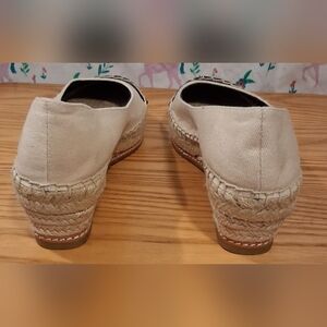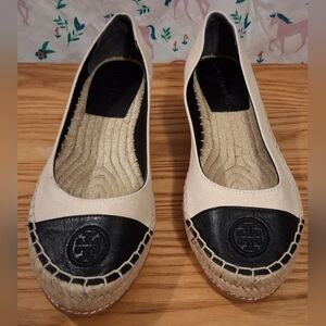 EUC Tory Burch Black Leather & Tan Canvas Casual Boho Wedge Heel Shoe SZ 6M