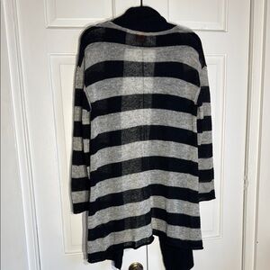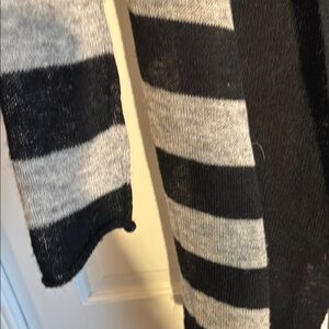 Elegant Tory Burch cardigan with black and gray stripes. Shawl collar. Light weight. Open front. Ideal for any occasion.