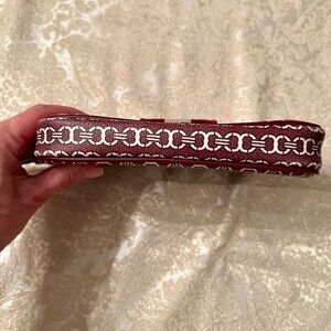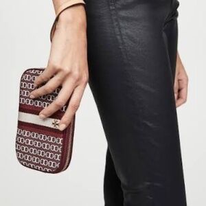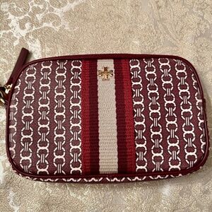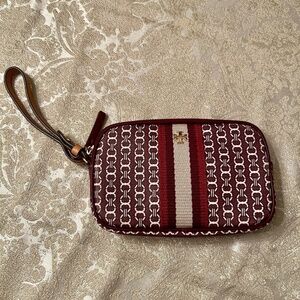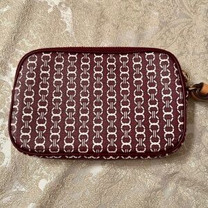 EUC Tory Burch Gemini Link Coated Canvas Wristlet Burgundy & Tan